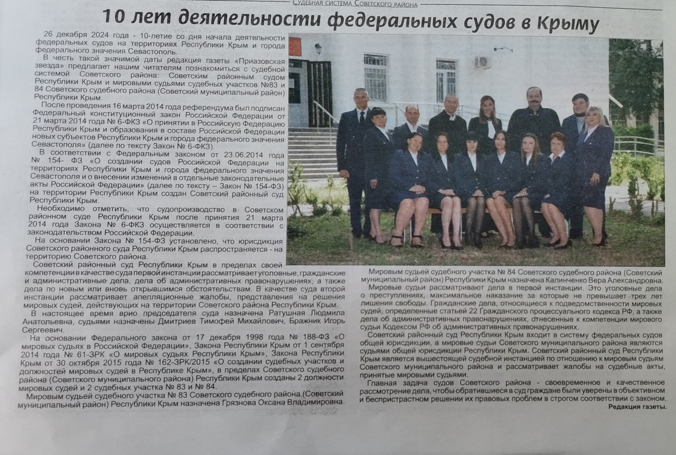 Статья в газете "Приазовская звезда", посвященная 10-летию начала деятельности федеральных судов на территориях Республики Крым и города федерального значения Севастополь.